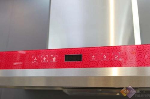 万家乐CXW-200-E6R07油烟机在外形设计上并没有沿用银灰结合的色调搭配,不锈钢的机身采用了红色装饰面板,配以祥云花纹,时尚前卫。这是一款T型设计的油烟机,集烟罩采用一次拉深成形,无沟无槽,杜绝滴油漏油。