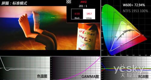 本次测试我们先在投影机的标准模式下进行,我们通过专业级色彩管理测试套件ColorFacts对投射图像各项指数进行详细测试。其中涉及测试项目有色域、色温、GAMMA曲线以及RGB三色,我们可以通过数值上的比较来更好的了解明基W600+的性能特点。从测试结果来看明基W600+的ANSI对比度为201:1,这个成绩并不突出,不过它的Brilliant Color功能与3D 色彩管理双管齐下,使W600+的颜色非常鲜艳精准,灰阶过渡也很平滑,色温也非常柔和。