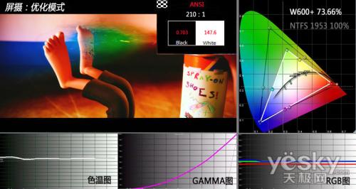 在对W600+进行了色彩优化后,测试的结果好了不少,达到了210:1的ANSI对比度,色域范围也达到了73.66%,RGB更接近了标准值,色温也更加平稳,可见明基W600+的可操作性还是挺强大的。