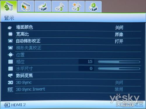 显示菜单中的墙面颜色选项可以根据用户所投的环境不同来进行设定,尽量的把真实颜色还原,用户不必担心所投影墙面的颜色问题。自动梯形校准是投影机中比较实用的功能,可以让用户更方便的调节画面。