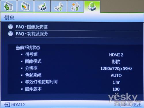 明基W600+投影机讯息菜单中,人性化的标出了灯泡的使用小时,根据2000小时左右的灯泡寿命,可使用户知道差不多什么时候可以换灯泡了。