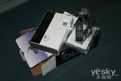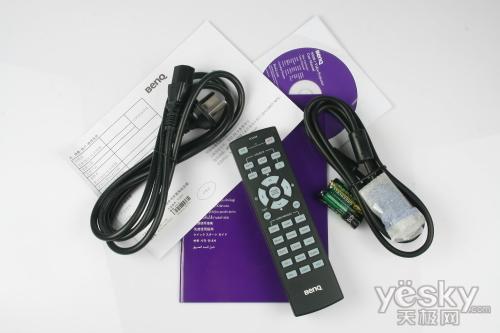 在主包装盒内主要配件有电源线,VGA线,遥控器,说明书,还热心的附送了两节遥控器电池。值得一提的是投影机盒内还有一张保修卡,万一用户在使用过程中出现什么故障可以用到。