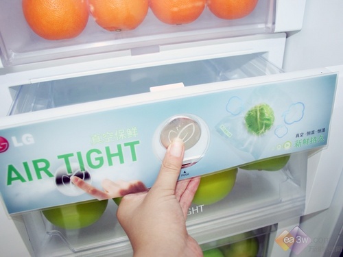 LG GR-C247DGN在保鲜方面,选用了真空保鲜盒设计,所谓真空保鲜盒,就是具有一个可以抽离空气的装置,只需要轻按就能达到把盒内的空气抽取出来的效果,保证蔬果的新鲜度。