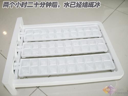制冰时间篇:冰箱在零下20度的温度下运行24小时后,编者将注满水的制冰盒放进冰箱内部,经过140分钟后,盒内全部结冰,用时适中,等待的时间不会太长。