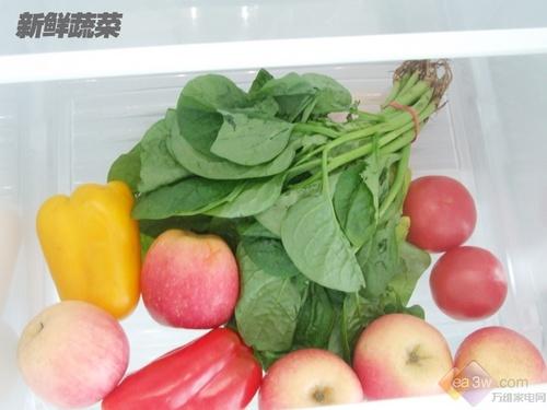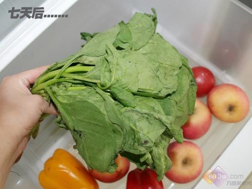新鲜效果篇:冰箱的冷藏室在6度温度设置下运行了24小时后,编者将新鲜的蔬菜放入冰箱内,7天后,蔬菜的水分被涵养的很好,发蔫程度较轻,保鲜效果表现令人满意。