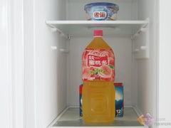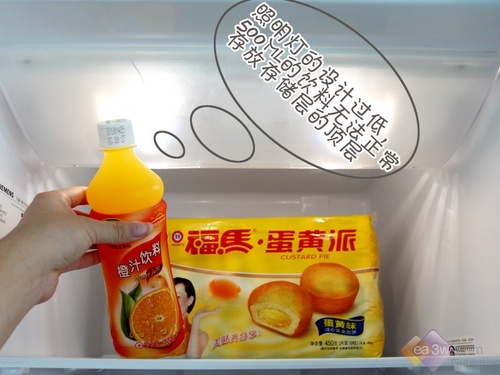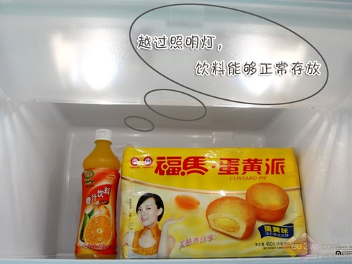 冰箱选用隐藏式的照明方式,这种隐藏式照明灯给编者存放饮料带来了一点小小的麻烦,当编者将一瓶500ml的饮料放在存储顶层的时候,照明灯的护罩让饮料无法正常存放,可是当编者将饮料倾斜后,绕过灯罩,饮料可以“站在”隔板之上。因材,编者提醒使用者,在存储饮料时,轻轻绕过灯罩,避免磕坏灯罩。