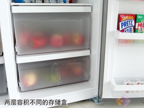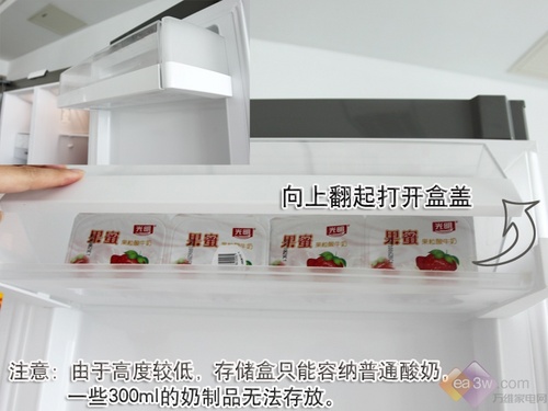 西门子KA62NV40TI的奶制品存储盒对于存放300ml的奶盒显得有些“力不从心”,只能存储高度和宽度都相对较小的酸奶盒,