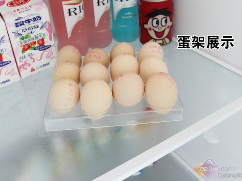 这款冰箱只有一个可以容纳12枚鸡蛋的蛋架,无法满足家庭中鸡蛋的使用量,因此,编者建议消费者要自备存储鸡蛋的容器了。