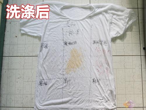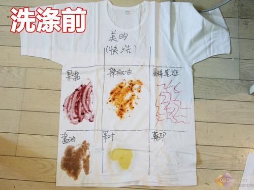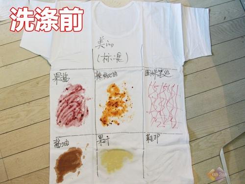 1.分别用一汤匙的蓝莓果酱、辣椒油、果汁、酱油以及鞋印、圆珠笔迹涂抹在待测衣物的固定位置,待20分钟后进行洗涤,测试洗涤效果。
