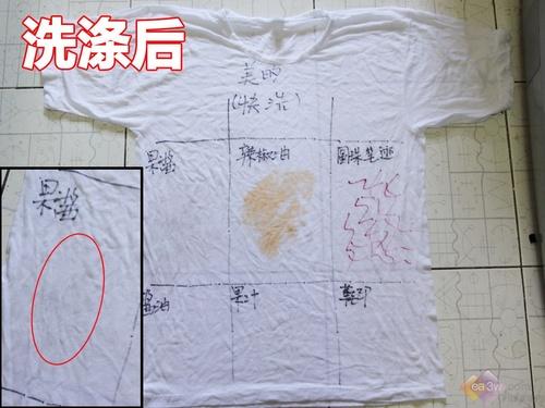 洗净度测试总结:酱油、果汁、鞋印等一些较浅的污渍洗涤效果比较出色,而且就连水彩笔的格子印迹都有所减退;美中不足的是果酱洗过之后留有黑色的痕迹。