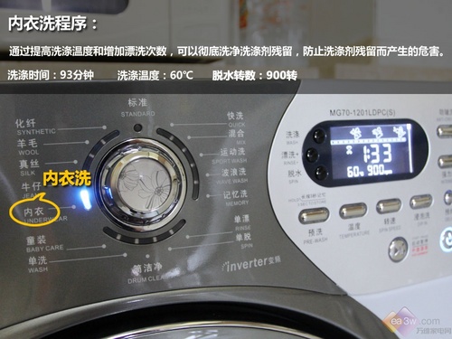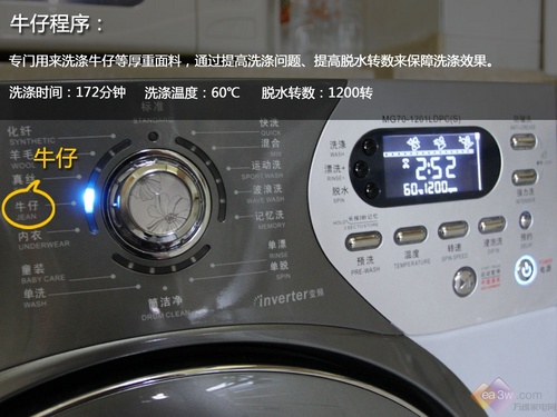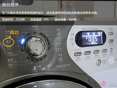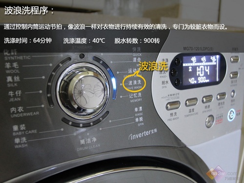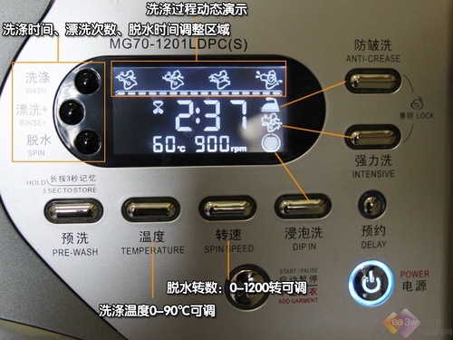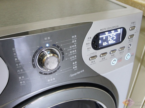 在操作面板方面,采用了LCD液晶显示屏,可以轻松掌控整个洗涤过程;另外,电子模式拨盘操作手感极佳。