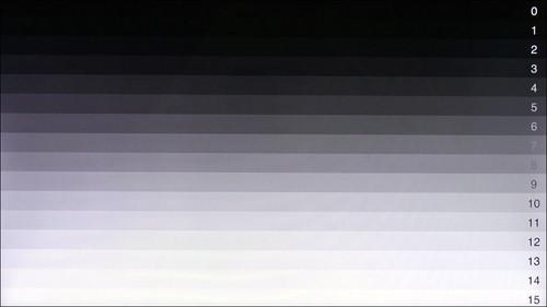 首先进行测试的是15梯度灰阶测试,从实际画面来看,索尼KDL-60LX900液晶电视表现令人满意,能够很容易地区分出每个灰阶梯度,0与1、14与15灰阶区分均非常明显。
