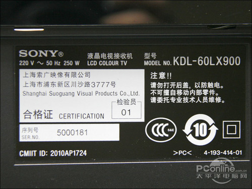 60LX900机身铭牌上标明了这款液晶电视的详细型号、序列号、生产厂商及地址,250W的额定功耗对于一部60寸大屏幕LED背光的液晶电视来说,属于正常范围。