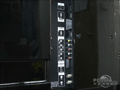 另一部分在机身的背面,采用了凹入式设计,和侧面接口一样是直排式的排列,配有1组LAN接口,2组HDMI高清影音接口,2组AV接口,1组光纤接口,1组有线接口,1组天线接口。