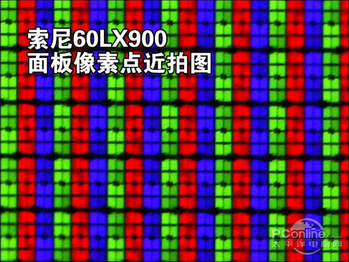 以下是索尼60LX900的液晶面板像素点近拍图,从像素点形状来看,白色画面红、蓝、绿三色呈竖状长方形排列,像素点内部分为上下两个部分,上部和下部方框内均呈“十”字型,这种像素点与索尼以往使用的液晶面板像素点略存差异,官方宣称该面板为绚丽黑曜面板,具体来源则有待确认。