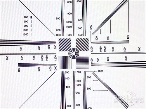 在Monoscope全高清1080p信号测试中,索尼60LX900在横线、竖线、斜线、圆圈等线条上的表现比较清晰,而在1080p线条的表现上一般,有轻微的重叠现象。