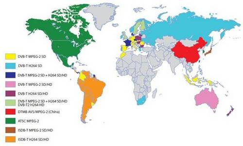 根据所有DTT标准的视频压缩标准,我们可以画出图6,说明2010年全球推出的DTT标准, 以及图7,说明视频压缩标准子集的全球分布情况。