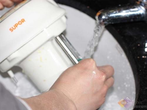 5.清洗,豆浆机是否易清洗是普通家庭比较关心的,本机的杯体内壁和机头下盖处可直接用水清洗。但是本机在清洗网罩的时候会稍微费事点。