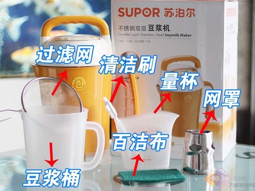 这款苏泊尔DJ16B-11G豆浆机是2010年推出的新品,它采用塑料的外观材质,不锈钢的内胆,双层杯体设计,不但可以有效的防止烫手,而且还具有保温的作用,即使你不马上饮用豆浆,也不用担心会变凉。