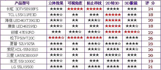 | 产品型号 | 外观 总分15分 | 3D体验 总分28分 | 功能 总分15分 | 2D画质 总分22分 | 菜单 总分5分 | 耗电量 总分5分 | 价格 总分10分 | 总分 共100分 |