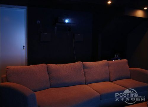 另外,还把影院布置成漆黑色,四面的墙上铺了一层专业黑色的吸音吸光的材料。我们都知道,黑色吸收光线,背景墙漆成黑色,这样可以改善画质,黑色的表现力得到加强,暗部的细节部分也表现比较细致。