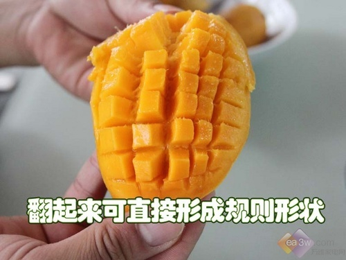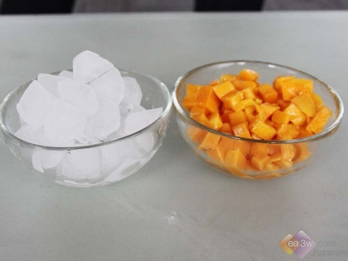 需要注意的是,要把芒果切成类似黄豆大小的块状,方可搅拌榨汁机。切好之后,将各种材料按照10:10:21的比例配好,等待制作。