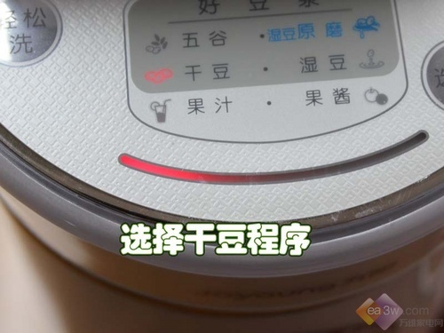 在使用前,先将机器内胆和过滤杯洗干净,再将豆子清洁干净备料。机器接通电源后,将豆子倒入内胆中,为了节省时间,我们制作干豆豆浆。轻触“启动”按钮,我们就可以等待豆浆的出炉了。