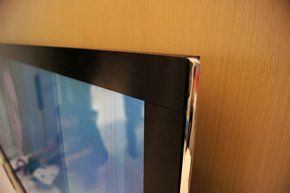 这款21:9的电视在做工方面毫不含糊,正面黑色金属拉丝公益配银色镶边,Logo下方有蓝色灯光衬托让它在夜晚中更为明显。