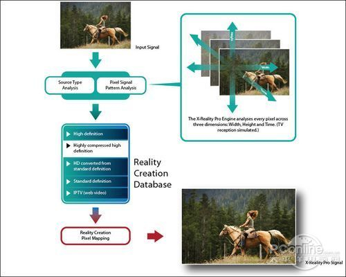X-Reality Pro基本流程是图像先经过X-Reality进行降噪处理,去除表面的蚊式噪波点,再由XCA7按照时间轴进行拆解,然后和数据库内的数据进行对比和分析,修复流失的细节。这样能还原最原始的图像,达到超解像的目的。