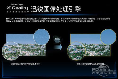 至于迅锐图像处理引擎Pro(X-Reality Pro)和迅锐图像处理引擎(X-Reality)的区别,上文已作了简单的介绍,X-Reality Pro是在X-Reality单芯片的基础上增加了一块名为XCA7的高端图像处理芯片,可以对画面细节进行智能对比。