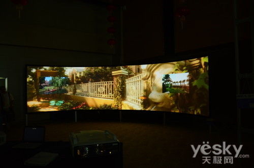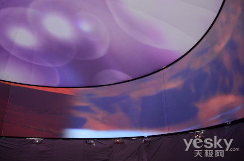 360度环幕投影系统采用8台EB-C520XB投影机组成环形投影屏幕,环形投影屏幕半径为360度弧度;由于其屏幕半径宽大且360度闭合,观众身处环幕中间,视觉完全被包围,再配合环绕立体声系统,使观众充分体验一种高度身临其境的三维立体视听感受,获得一个具有高度沉浸感的可视环境,是传统屏幕投影不能比拟的。