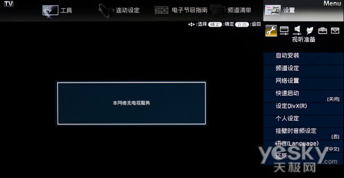 在设置菜单中提供了视听准备、图像、音频、节能、选项、信息等六个小项,相比以往的产品,夏普这款产品在视听准备菜单中新增了自动安装、频道设定、挂壁时音频设定等多个选项,更加细化的菜单设置体现了其注重用户体验感受的设计理念。