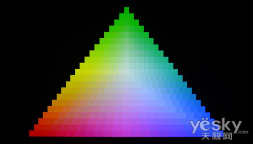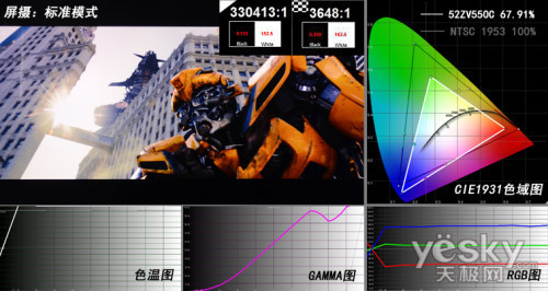 从此次的测试结构来看,我们可以发现两点异样,一是伽马曲线顶点的曲折、二是NTSC色域图上黄色坐标点的偏离。首先伽马曲线的扭曲并不是此款液晶电视性能的问题,而是其“煌彩”技术的缘故,在某些测试环境下会呈现一些独特的数值;其次NTSC色域图上的黄色坐标点明显偏离中心三角区,实际色域范围会是红、黄、绿、蓝四坐标点相连的四边形区域。所以,真实的色域范围预计应该要比目前测试数据还要增加20%左右。