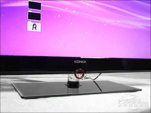 康佳IS97系列机身屏幕左上角光滑简洁,没有喷涂任何的标志或LOGO。机身下部镶嵌的透明装饰条,加上圆环形的指示灯,为机身外观增添了几分科技感。IS97系列宽大的方形底座上方是酒杯式的支撑架,其透明的外观显得非常时尚,摆放在桌面上也显得稳重大气。