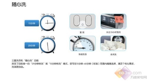 除此之外,即时添衣,零功率待机,断电记忆,专用储物底座,防烫罩,童锁功能,紧急排水,超静音设计,和弦铃声都是这款洗衣机的一大亮点。