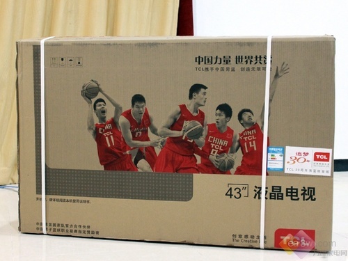 从外包箱上可以看到TCL L43V7300A-3D是一款TCL 30周年男篮限量版液晶电视,并且拥有1级能效比,来头不小。此外,TCL L43V7300A-3D还是一款配备Android操作系统的智能电视,拥有3D播放功能。