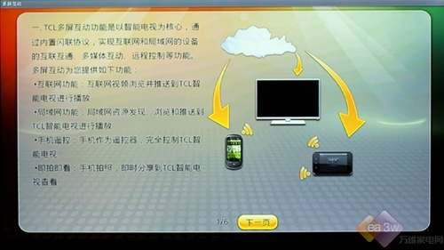 TCL L43V7300A-3D的多屏互动功能是以智能电视为核心,通过内置闪联协议,可以实现互联网和局域网的设备的互联互通、多媒体互动、远程控制等功能,是目前市面上最强大的多屏互动功能,其全家共享的特点大大增强,主要有以下四点: