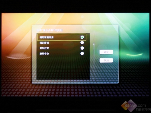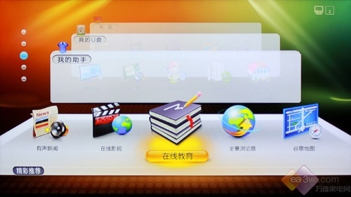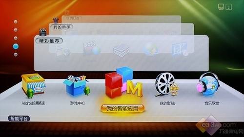 作为TCL全新推出的云电视,TCL L43V7300A-3D与TCL此前推出的智能电视首先在界面上就变得更加立体、动感化。如下图所示,TCL L43V7300A-3D的主菜单不再像以前的主菜单一样选项罗列,而是采用了弹出式显示,背部的选项半透明显示,图标也设计为采用3D动态图标,相当炫 丽。