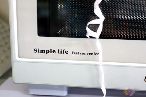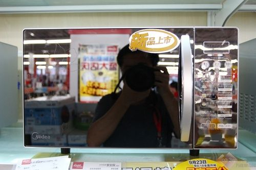 美的微波炉EG720FF1-NS采用了镜面横开式设计,适宜各种高度摆放,炉门拉手为银色金属设计,与镜面的面板搭配相得益彰,时尚高档。控制面板为轻触式设计,为了统一风格,也是用了镜面材料,不过与炉门的玻璃材质不同,这块镜面材料为塑料材质,平整性和光泽都较之玻璃逊色不少,光线照射下反射不均匀,影响了整体效果,希望能考虑改进。因为产品定位的原因,该机的LCD液晶也比较简单,只有四位数显,可以满足基本的查看时间需求。