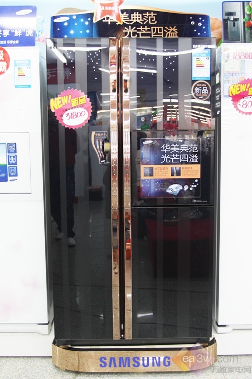 三星RS26MBZBL称得上是三星对开门冰箱的“旗舰”产品,首先在外观上就有着较大的突破。大胆的选用黑色面板与金色把手带搭配,彰显豪华尊贵气质,在面板上还有钻石型装饰,开启冰箱门的时候装饰会瞬间亮起,闪耀整个厨房。