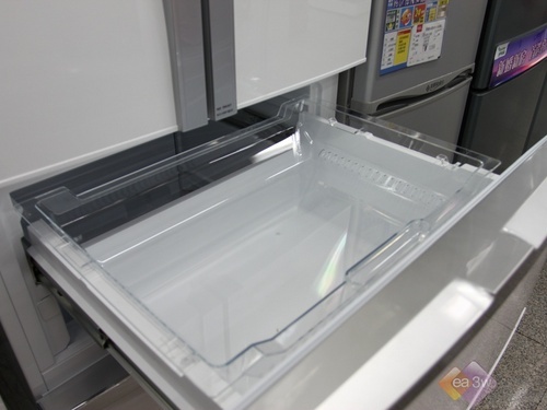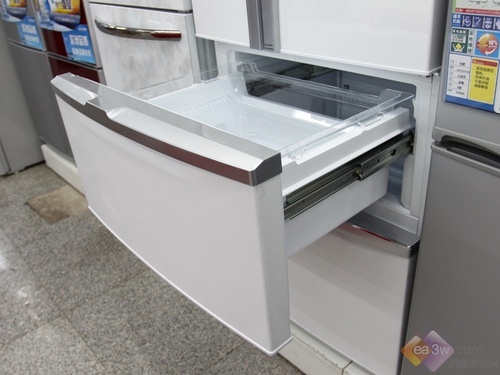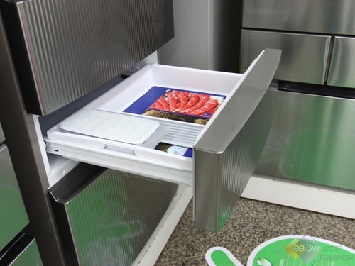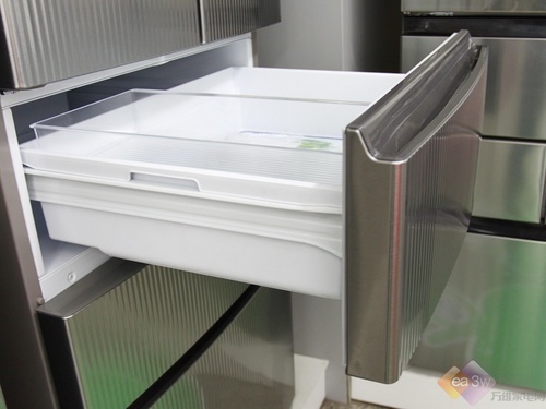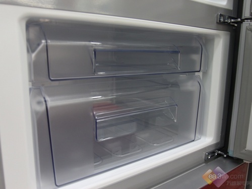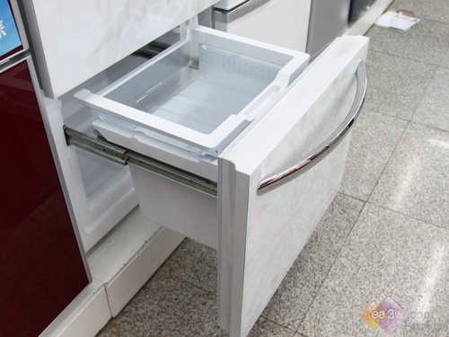 冰箱的冷冻室选用抽拉设计,这是近年来比较流行的一种设计,方便人们拿取食物,也能够,扩充冰箱体积,外观上还具有一定的优势。