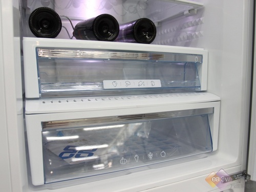 冷藏室内部有可折叠式钢化酒架装置,同时具有可调湿度果蔬盒设计,果蔬放在里面,使用者可根据自己的需要调适湿度。