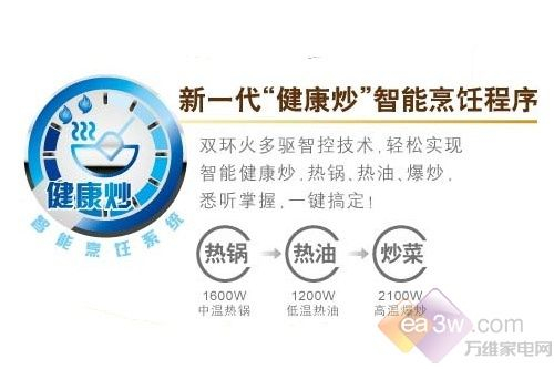 特色功能:九阳电磁炉JYC-21GS05“健康炒”智能烹饪程序可以说是一项电磁炉功能的革命性改进,作为一款以“爆炒”为主打的电磁炉产品,九阳使用“健康炒”程序控制加热功率,开启健康炒后电磁炉默认以1600w的功率开始热锅,然后自动转变为1200w的智能热油模式,热油完成后功率直接提升至2100w,进入双环大火炒菜模式。【详细】