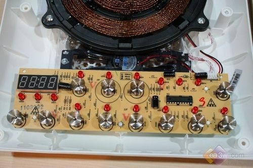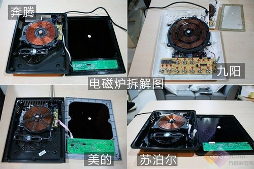 拆下面板后,电磁炉的内部就完全暴露出来,奔腾、苏泊尔、美的这三款产品内部设计基本相同,特别是苏泊尔和奔腾的产品,电磁线圈匝数及元器件布局惊人相似。