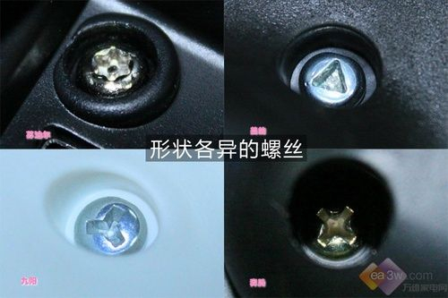 不过一上来开拆的时候就遇到了麻烦,我们发现四款电磁炉产品所用的螺丝各异,其中比较常见的只有奔腾的十字螺丝,美的的三角形,九阳的人字形,而苏泊尔的螺丝形状更是奇特,看似内六角中还有一根小柱。