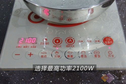 通电后按下开关,选择2100w的最高功率进行加热操作。