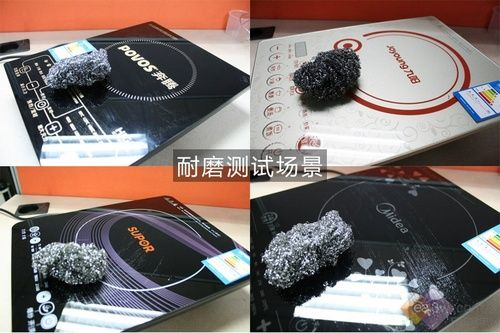 经过钢丝球擦拭研磨的微晶面板表现都不错,没有出现明显的划痕,其中九阳和美的的电磁炉产品因为印刷层在微晶面板的下方,所以更不会出现印刷层被磨损的情况,耐磨性能会更好,得到了满分并列第一,而奔腾和苏泊尔表面印刷部分在长期使用后会脱落而影响美观,只能获得并列第二的成绩。