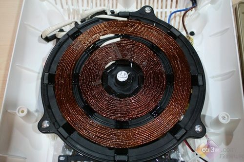 而九阳的加热电磁线圈部分的设计更是亮点,能明显看到有两股匝数相同的线圈成同心圆分布。这和九阳宣称的内环小火、双环大火设计完全一致,内环小火通过内侧线圈实现低功率工作,双环大火是通过对双线圈协同工作实现更高加热功率。