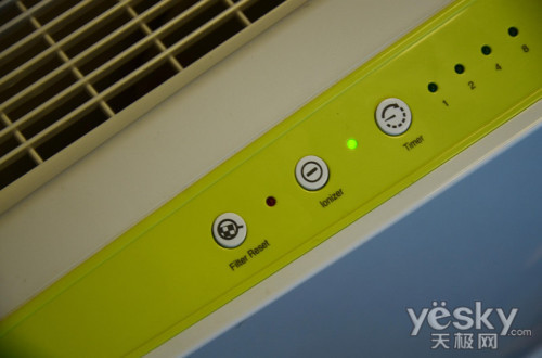 我们可以从机身上看到,一共有5个按钮,分别是:开关、定时、风速、负离子功能、滤网更换指示器。定时:按压此键可以设定运转时间,再按一次其变换顺序为1-2-4-8小时。按定时间之后,空气净化器会依照所设定的时间运转,时间到会自动关闭。