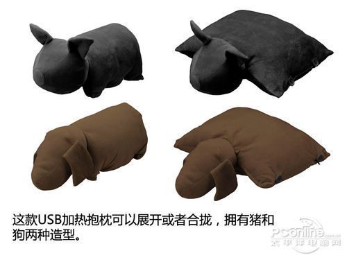 这款抱枕拥有狗和猪两种动物的造型,比较特别的地方是可以扣上扣子作为抱枕或者打开作为坐垫使用。并且可以通过USB接口或者直流电源接口为抱枕充电,在冬季无论外出还是在办公室、家里使用都十分适合。